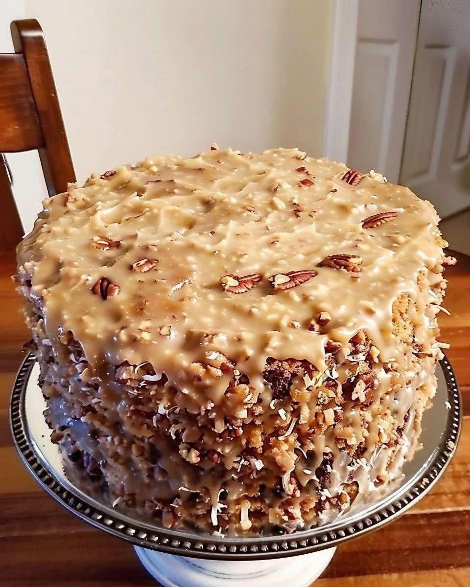 · Pour the warm German chocolate glaze over the top of the cake, allowing it to drip down the sides.